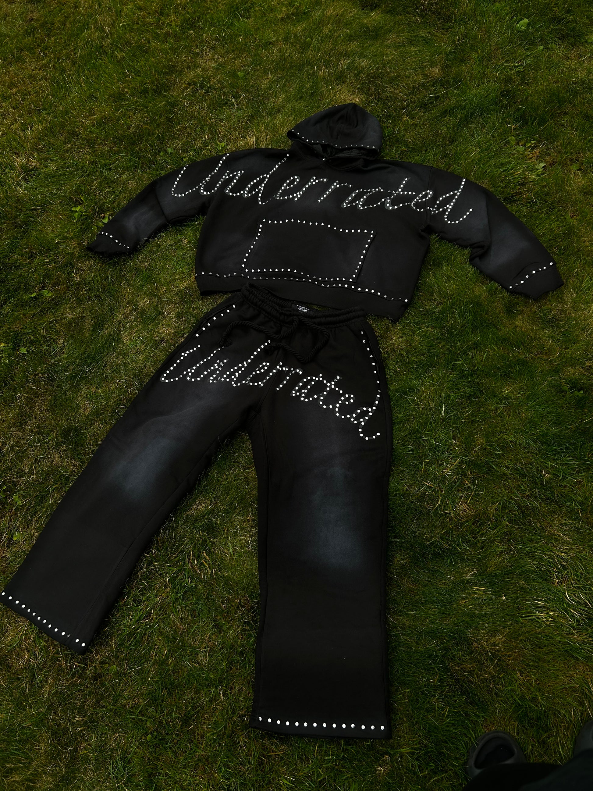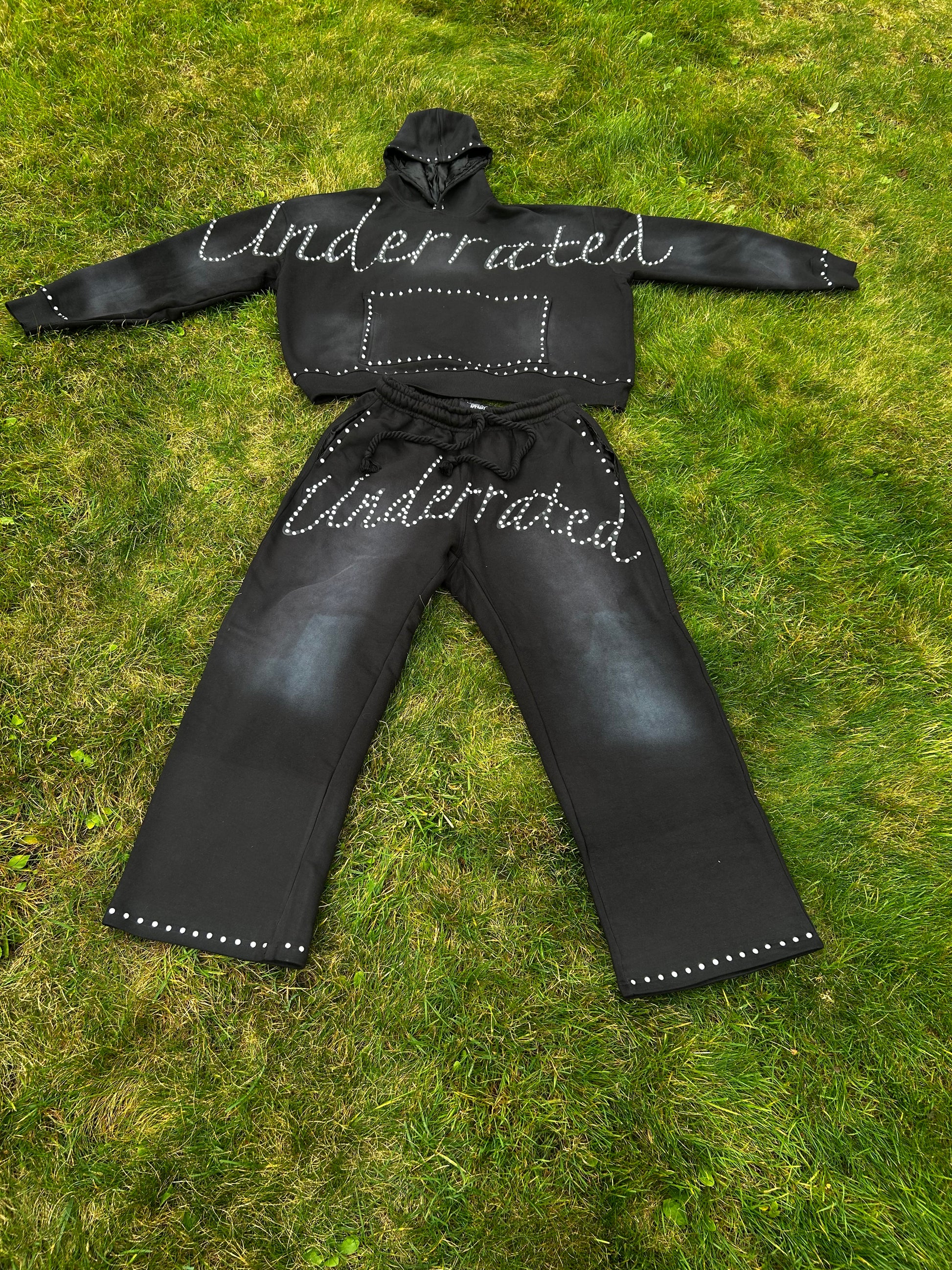 The "underrated" text at the crotch area will be embellished with rhinestones.