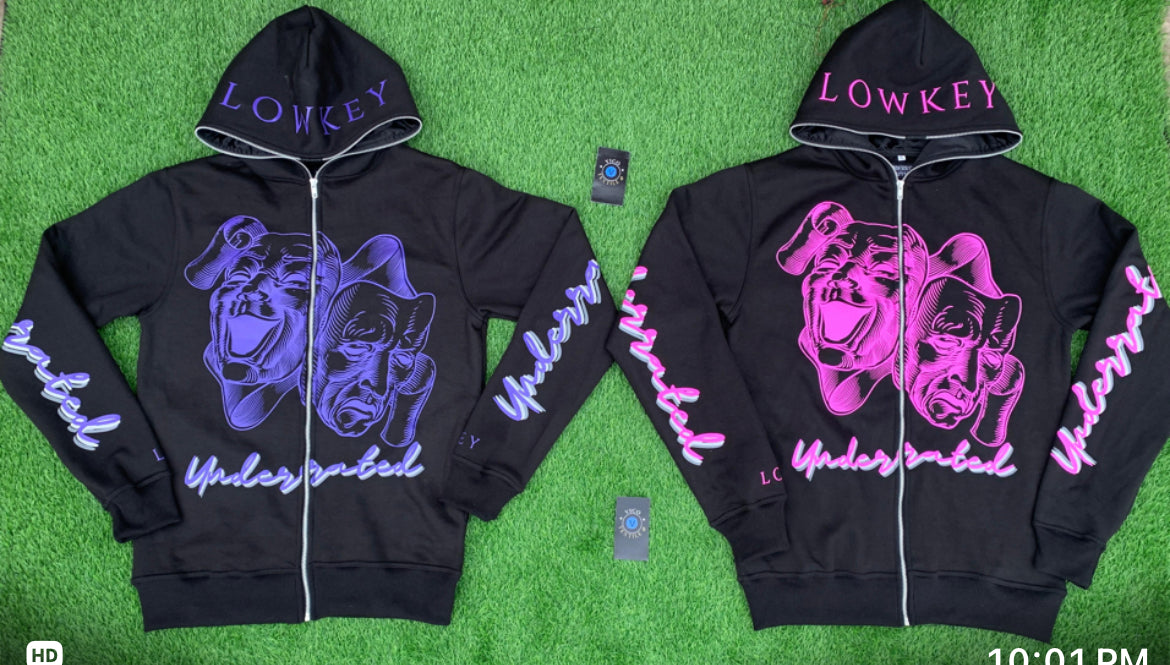 Design: Laugh Now Cry Later design on front, smaller one on back, with LAUGH NOW CRY LATER written on the back. Underrated across lower stomach and back of both arms. LOWKEY across hood